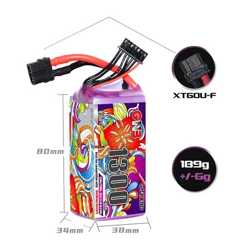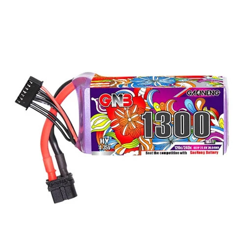 La batterie LiHV GaoNeng GNB dispose d’une capacité de 1 300 mAh et d’une tension de 6S. De dimensions de 34 x 38 x 80 mm avec un poids de 189 g, cette LiHV comporte aussi un taux de charge de 1 à 5C et un taux de décharge de 120C et de 240C en rafale. Elle possède un connecteur XT60 pour faciliter son branchement.