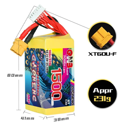 La batterie LiHV GaoNeng GNB vous garantira de belles performances de vol. De dimensions de 41 x 38 x 80 mm avec un poids de seulement de 231 g, cette LiHV comprend une capacité de 1 500 mAh, une tension de 6S et un taux de décharge de 160C. Cette batterie LiHV intègre un connecteur XT60 pour faciliter son branchement.