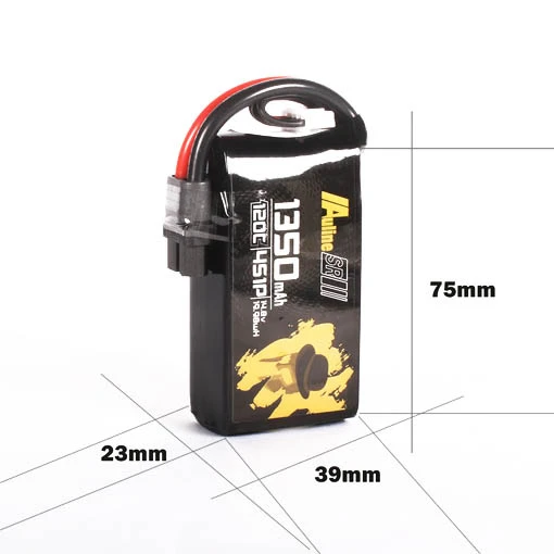 Optez pour cette batterie LiPo SR Auline pour apporter puissance à vos vols FPV. Elle pèse environ 153.5 g et offre des dimensions de 75 x 39 x 23 mm. La batterie est dotée d’un connecteur XT60. Elle dispose d’une capacité de 1350 mAh, d’une tension de 4S et d’un taux de décharge de 120C.