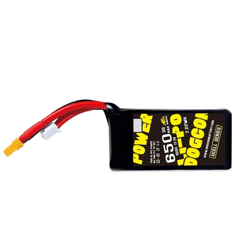 Optez pour cette batterie LiPo Dogcom pour vos sessions de vol FPV. Elle appartient Ă la UCELL Series qui garantit un excellent rapport qualitĂ©/prix. Cette LiPo dispose d’une tension de 3S, d’une capacitĂ© de 650 mAh et d’un taux de dĂ©charge en continu de 150C (300C en pic). Elle pèse environ 67 g et elle est dotĂ©e d’un connecteur XT30.