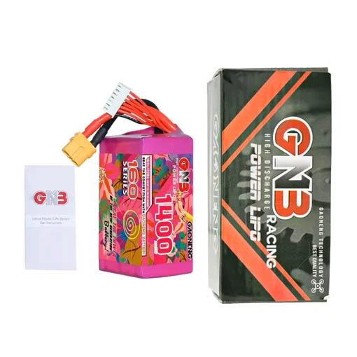 La batterie LiPo GaoNeng GNB comprend une capacité de 1 400 mAh et une tension de 6S. De dimensions de 40 x 38 x 80 mm avec un poids de 233 g, cette LiPo GaoNeng dispose aussi d’un taux de décharge continu de 160C et de 320C en pic. Elle comporte de plus un connecteur XT60 et une prise d’équilibrage XH-JST 7P pour faciliter son branchement.