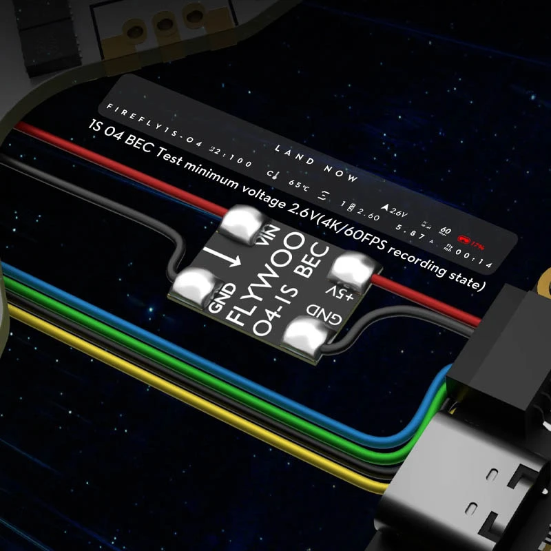 Ce BEC Flywoo est un module BEC externe conçu particulièrement pour le VTx DJI O4 Air Unit Series. De dimensions de 11,5 x 8,2 x 2,5 mm avec un poids de seulement 0,3 g, ce BEC convient aux micro drones FPV de 1,6 à 2 pouces alimentés par 1S. À la fois ultra-léger et compact, ce BEC accepte une tension d’entrée de 2,65 à 5 V et fournit une tension de sortie continue et stable de 5 V 3 A. Ce module BEC bénéficie aussi d’une protection anti-surchauffe pour une meilleure durabilité.