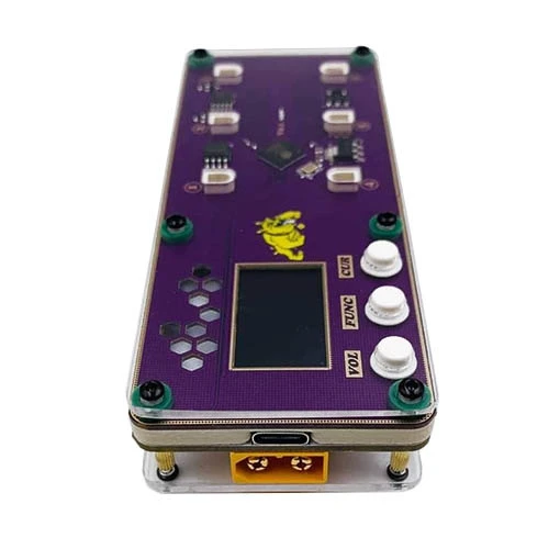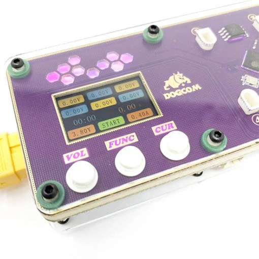La touche VOL sélectionne la tension de coupure entre 3.8V, 4.2V et 4.35V (la charge par défaut de 0.3A n’est pas sélectionnable à une tension de coupure de 3.8V).