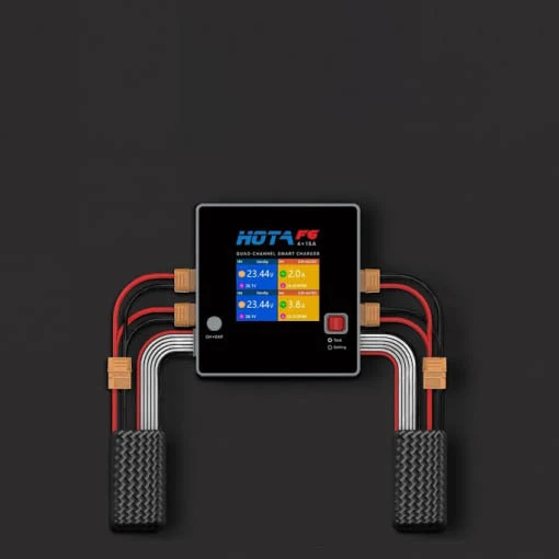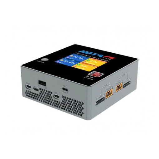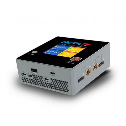 Le chargeur HOTA F6 est Ă©quipĂ© d’un Ă©cran IPS couleur de 2,8 pouces dotĂ© d’une interface très intuitive. Vous pourrez accĂ©der Ă de nombreuses fonctionnalitĂ©s telles que la charge, la dĂ©charge, la charge rapide, l’Ă©tat de vos batteries ou encore le stockage. Puissant, compact et lĂ©ger (seulement 475 g), ce chargeur permet de charger simultanĂ©ment jusqu’Ă quatre batteries. Il comporte aussi deux ventilateurs pour dissiper la chaleur et permettre une utilisation plus durable et sĂ»re.