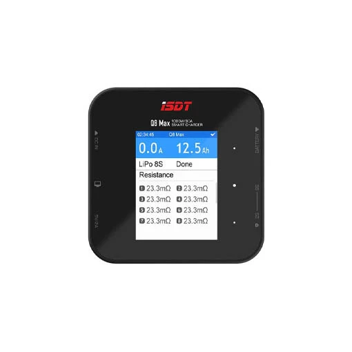 Le chargeur ISDT Q8 MAX dispose d’une sortie pour charger et décharger vos batteries. Il est d’ailleurs compatible avec les batteries intelligentes BATTGO, les LiFe, Li-ion, LiPo de 1 à 8S, les LiHV de 1 à 7S, les batteries au plomb de 1 à 12S et les NiMH, NiCd de 1 à 16S. De dimensions 95 x 95 x 45 mm avec un poids de 288 g, ce chargeur possède une entrée de source de 10 à 34 V. Sa puissance de charge peut atteindre jusqu’à 1 000 W (DC).