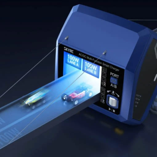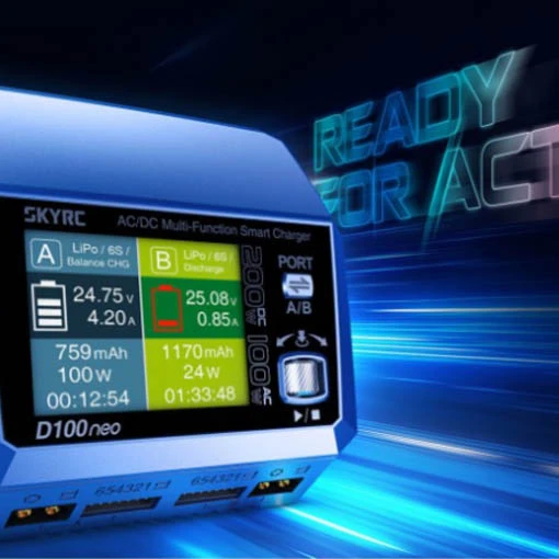 Le chargeur SkyRC D100 est doté d’une double entrée AC/DC, de deux sorties XT60 avec prises d’équilibrage et d’un écran rétroéclairé de 2,8 pouces. De dimensions de 116 x 110 x 79 mm avec un poids de seulement 470 g, ce chargeur léger pourra vous suivre lors de vos déplacements et de vos sessions de vol. Vous pourrez charger jusqu’à 2 batteries simultanément. Ce chargeur SkyRC est d’ailleurs compatible avec les LiPo, LiFe, Li-ion, LiHV de 1 à 6S, NiMH, NiCd de 1 à 15S, ainsi que les batteries au plomb de 3S, 6S et 12S.