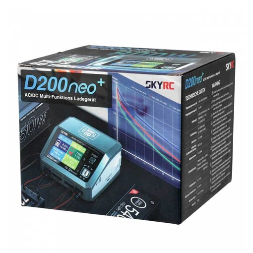 Le D200 Neo+ propose plusieurs fonctionnalités comme le contrôle via l’application (SkyCharger pour smartphone et Charge Master pour Windows/MacOS). L’appareil est doté d’un écran de couleurs, ainsi que d’une molette de défilement. Il prend en charge les batteries LiPo, LiFe, LiIon et LiHV de 1S à 6S, NiMh et NiCd de 4S à 15S et les Pb de 3S, 6S et 12S. Le chargeur dispose d’un port USB-C 3.0 pour une charge rapide 20W d’un appareil externe (portable, ordinateur, etc.).