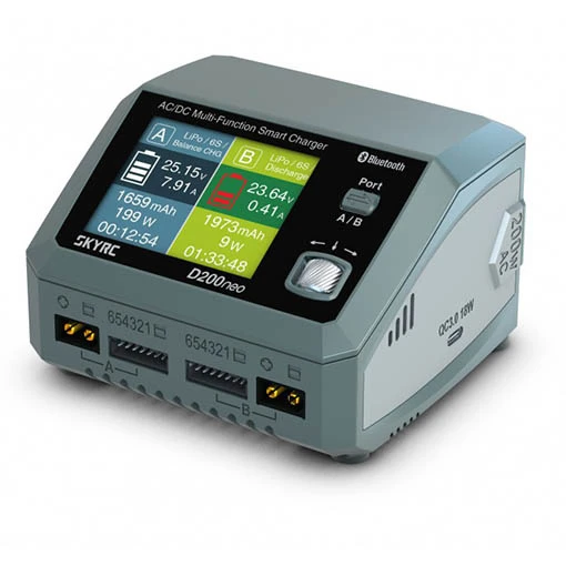 Ce chargeur D200 Neo de SkyRC dispose de deux ports indépendants permettant de charger simultanément deux batteries. Il offre une puissance de charge allant jusqu’à 200W en mode AC et 800W en mode DC. Le D200 Neo possède une charge parallèle à double port dotée d’un courant de charge rapide jusqu’à 35A (câble de charge parallèle non fourni). Il dispose également d’une alimentation USB-C 3.0 20W afin de charger efficacement et rapidement votre smartphone par exemple.