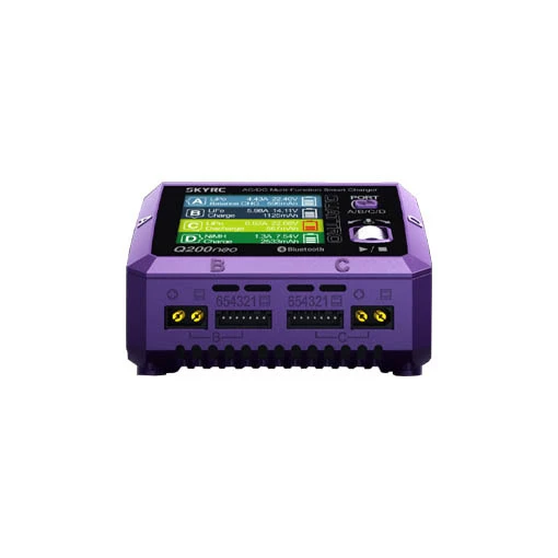 Le chargeur SkyRC Q200 Neo Quattro intègre une double entrée AC/DC, de quatre sorties XT60 avec prises d’équilibrage et d’un écran rétroéclairé de 2,8 pouces. De dimensions de 123 x 119 x 78 mm avec un poids de 680 g, ce chargeur SkyRC est idéal pour charger et décharger vos batteries lors de vos déplacements. Il pourra vous suivre partout ! Ce chargeur vous permettra de charger jusqu’à quatre batteries simultanément. Il est compatible avec les LiPo, LiFe, LiHV de 1 à 6S, les NiMH, NiCd de 2 à 15S, ainsi que les batteries au plomb de 3S, 6S et 12S.