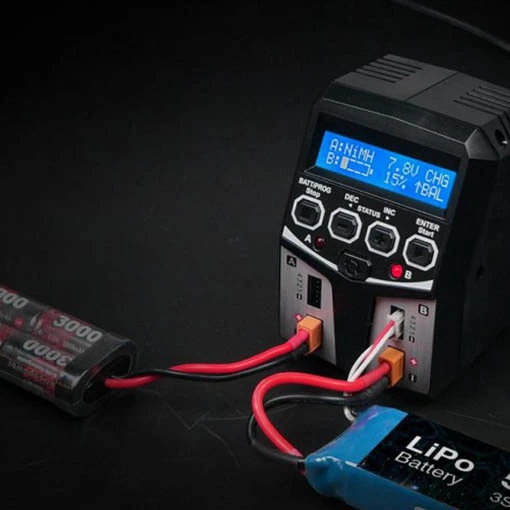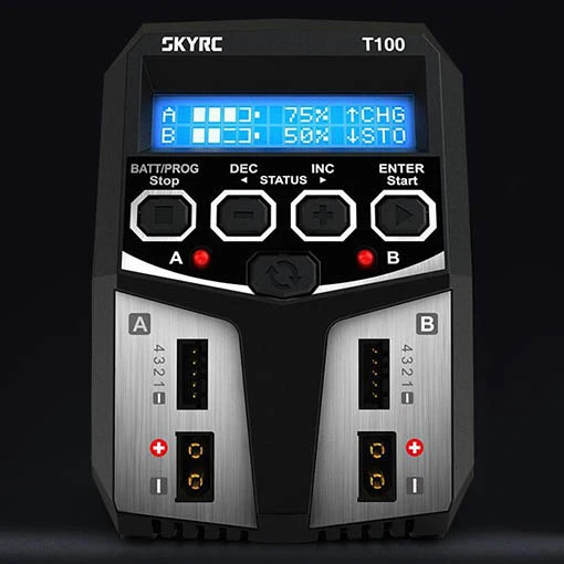 Le chargeur possède un écran qui affiche, grâce au logiciel du T100, la tension des deux batteries en charge avec 3 décimales, que ce soit en charge ou pour mesurer la tension. Vous pouvez choisir d’afficher le courant et la puissance de charge ou décharge en pourcentage. Chargez vos batteries au Plomb et AGM même par temps froid grâce aux nouveaux modes AGM et charge à froid du T100. Il est adapté à divers types de batteries au lithium, comme les LiPo, LiIon et LiFe (2-4S). Il est également compatible avec les NiMH (6-8S) et les PB 6/12V.