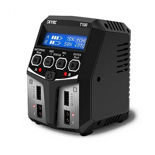 Le chargeur T100 de SkyRC est un chargeur double compact. Il est livré avec son câble d’alimentation AC. Il dispose de deux canaux avec circuits indépendants qui permettent de charger deux batteries en même temps via les connecteurs XT60 et les prises d’équilibrage. Les batteries n’ont pas besoin d’être du même type ni de la même configuration pour charger simultanément ! Le chargeur offre une puissance de charge maximale de 100W (50W de chaque côté) et un courant de charge de 5A.