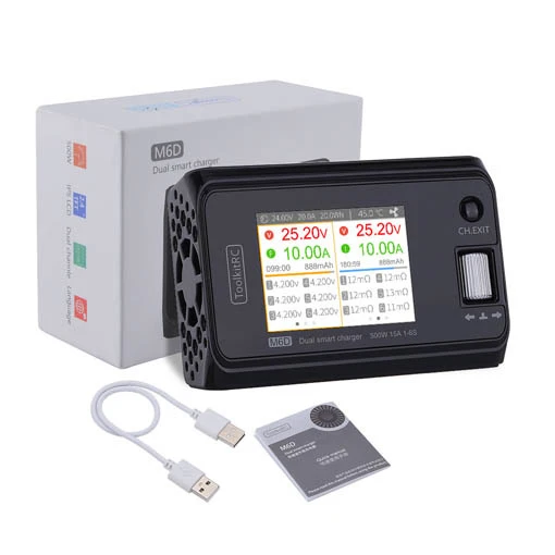 Le chargeur ToolKitRC M6D est doté de deux sorties pour charger et décharger deux batteries simultanément. Ce chargeur est d’ailleurs compatible avec les batteries LiPo, LiHV, LiFe et Li-ion de 1 à 6S, les NiMH de 1 à 16S et les batteries au plomb de 1 à 10S. De dimensions de 98 x 68 x 35 mm avec un poids de 220 g, ce chargeur ToolKitRC dispose d’une entrée source de 7 à 28 V. Sa puissance de charge peut atteinte jusqu’à 500 W (DC) et jusqu’à 500 W en décharge également.