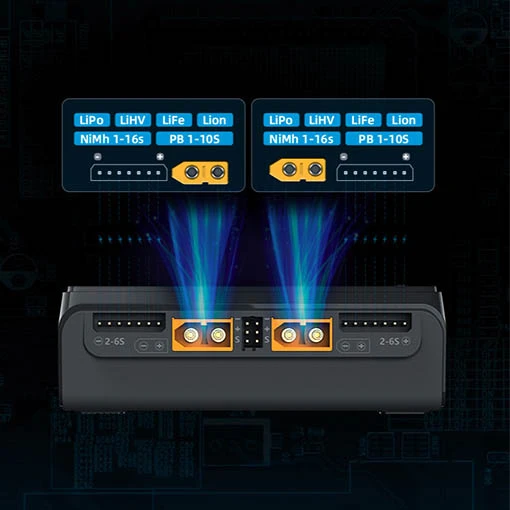 - Pris en charge des LiPo, LiHV, LiFe, Li-ion 1-6S, NiMH 1-16S, Pb 1-10S