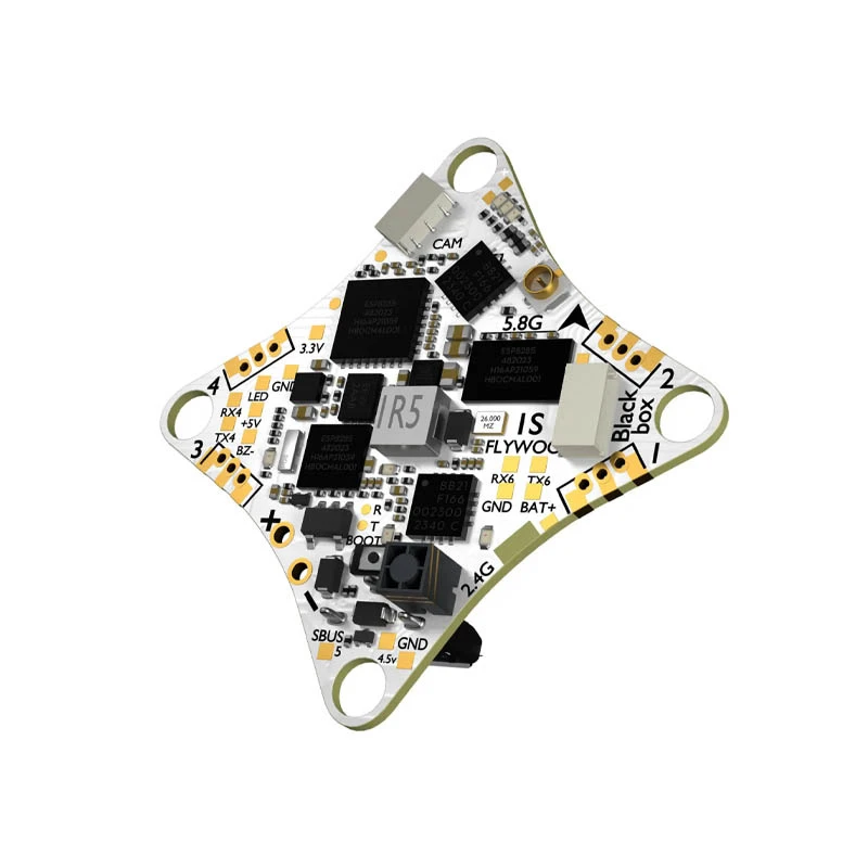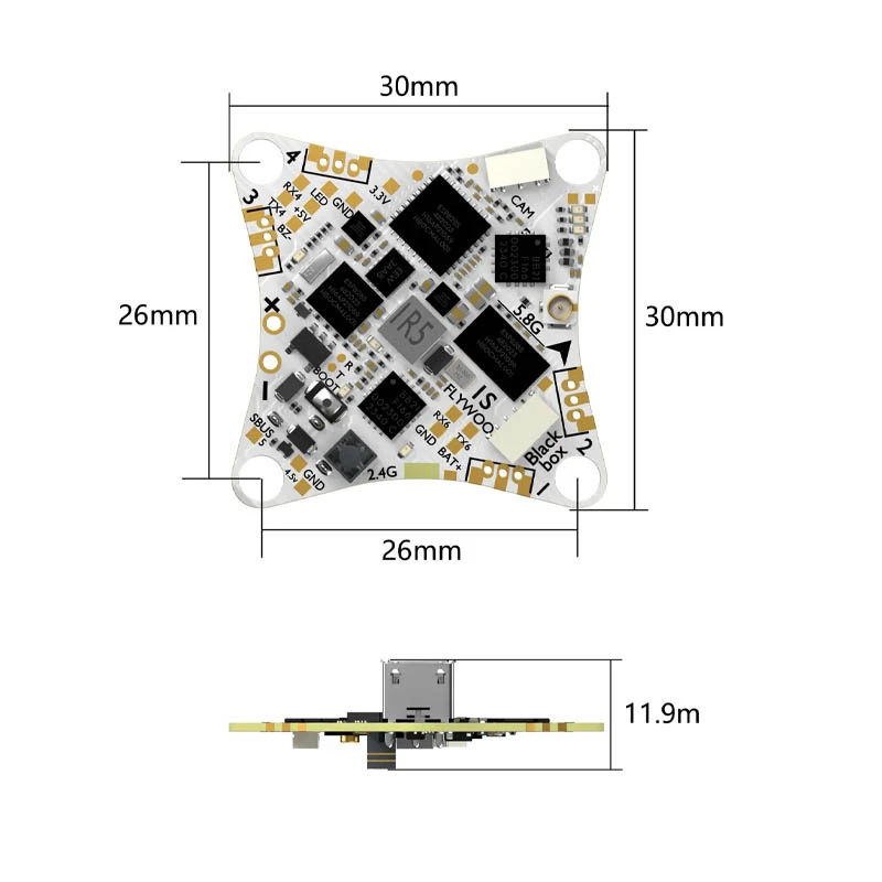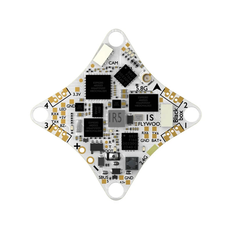 Cette carte de vol est plug-and-play pour les moteurs, caméra FPV et blackbox. Elle garantit une puissance de traitement 68 % supérieure à celle des puces F411 traditionnelles. Elle vous assurera en effet une latence ultra-faible, idéale pour les courses FPV ou vos manœuvres acrobatiques. Cette AIO Flywoo comporte des trous de montage de 25,5 x 25,5 mm pour faciliter son installation sur votre châssis. Pour l’alimenter, utilisez une LiPo de 1S (non fournie) via son connecteur A30.