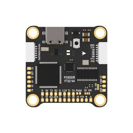 Le contrôleur de vol Foxeer F722 V4 8s est équipé d’un processeur STM32F722RET6, d’un gyroscope MPU6000, d’un baromètre DPS310 et de deux BECS (DC 5V/2A ; DC 10V/2A). Compatible avec une LiPo de 4 à 8S, cette quatrième version dispose aussi d’une Blackbox de 16mb, de 5 UARTS et d’un connecteur USB Type-C.