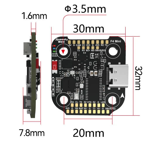 Cette FC F405 V3 intègre quatre indicateurs lumineux qui vous permettront de connaitre en temps réel le niveau de batterie pour des vols plus sereins. Cette carte de vol SpeedyBee peut être d’ailleurs alimentée par une batterie LiPo de 3 à 6S. Plusieurs trous de montages de 20 x 20 mm sont présents sur ce modèle F4 Mini pour faciliter son installation sur votre châssis.