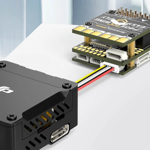 Le contrôleur de vol SpeedyBee F405 WING Mini est fait pour les multicoptères type avions et VTOL. Il conviendra également aux quads FPV. Cette carte de vol est dotée d’un processeur STM32F405, d’un gyroscope ICM-42688-P, d’un baromètre SPL006-001, d’un OSD AT7456E et de 6 UARTS. À la fois compacte, puissante et polyvalente, cette FC comprend également un port pour microSD pour la Blackbox. Munie du BLE et Wi-Fi, cette carte de vol SpeedyBee vous permettra d’effectuer vos mises à jour depuis les applications SpeedyBee et QGroundcontrol. Elle supporte les firmwares INAV et ArduPilot.