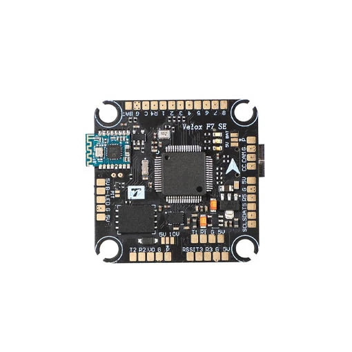 Le contrôleur de vol T-Motor Velox F7 SE est compatible avec la plupart des VTx numériques et analogiques. Il comprend d’ailleurs le PIT mode, permettant d’effectuer les réglages du VTx sans perturber les autres télépilotes en plein vol. Cette carte de vol T-Motor Velox est de plus dotée d’un processeur STM32F722, d’un gyroscope ICM-42688-P, d’un baromètre, d’un double BEC 5 V (2 A) et 10 V (1,5 A) et d’un OSD AT7456E. Cette FC comprend aussi une Blackbox de 128 Mb et 6 UARTS.