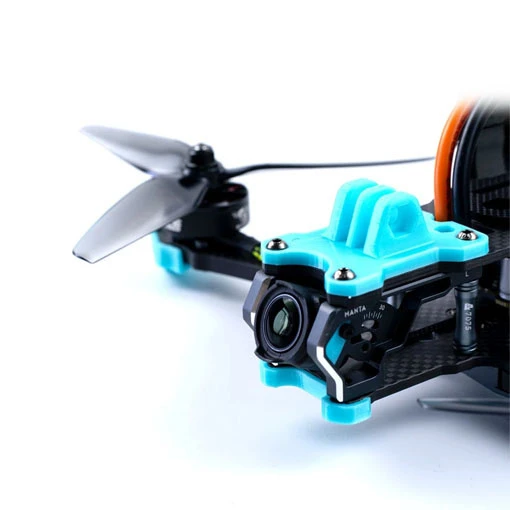 Le drone Manta 6″ fonctionne avec une batterie LiPo de 6s de 1 550mAh avec un connecteur XT60. Les TPU bleus fournis avec le drone vous permettront d’y placer votre caméra GoPro, Insta360, etc. Ils assureront la protection des divers composants du drone. L’avant du drone est aussi renforcé par des plaques en aluminium pour préserver votre caméra de potentiels impacts et chocs.