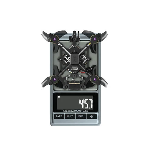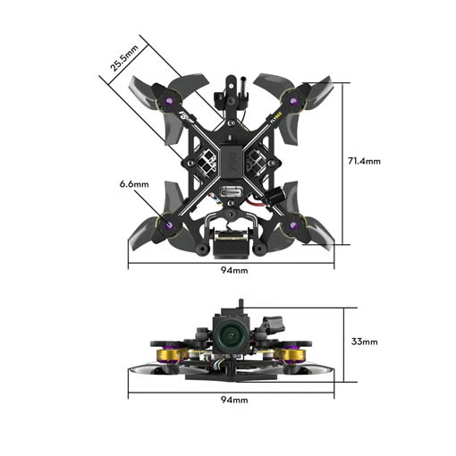 Ce quad Flywoo intègre une carte de vol GOKU F405 HD 2S ELRS V2, des moteurs de type pusher ROBO 1003 de 14 800Kv couplés à des hélices tripales 40mm 1611. Ses hélices à poussée inversée vous garantiront des vols plus stables et plus longs. Le Flybee 16 est fourni avec des supports pour batterie à dégagement rapide pour faciliter l’installation et le démontage de vos LiPo. Pour fonctionner, ce drone nécessite une LiPo de 2S (non fournie), à brancher directement à son connecteur XT30.