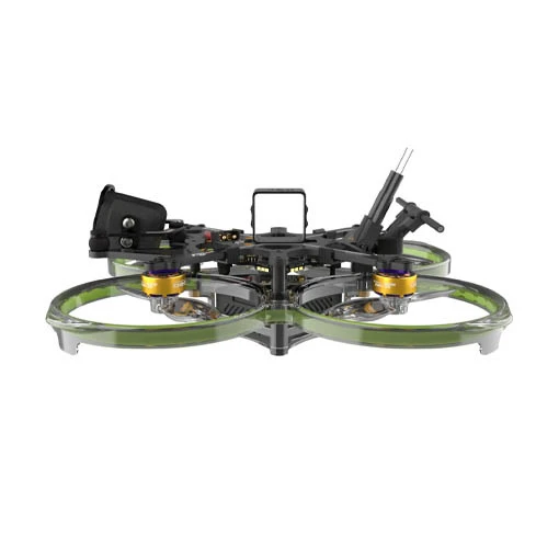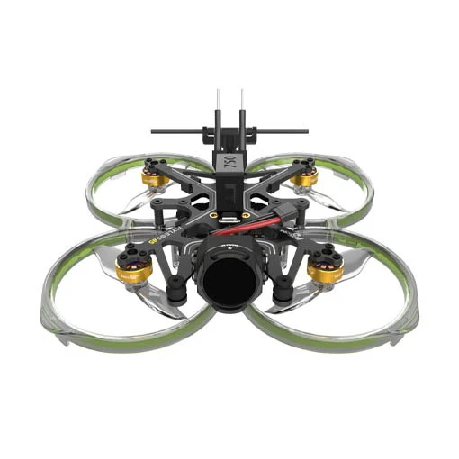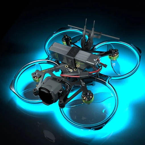 Le Flylens 85 comprend un châssis en fibre de carbone robuste avec une protection d’hélices moulée par injection pour plus de sécurité. Grâce à sa structure d’hélices à poussée inversée, bénéficiez de meilleures endurance et stabilité. Cette structure assurera aussi la réduction du bruit émis et facilitera le réglage de la position du centre de votre batterie. Ce drone dispose de LED pour gagner en visibilité dans les environnements peu éclairés. Vous pourrez ajouter une caméra d’action telle que l’Insta360 GO3, la Runcam Thumb, etc. Utilisez une LiPo de 2S via son connecteur XT30 pour l’alimenter.
