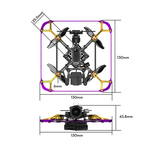 Le Flytimes 85 a été conçu par Flywoo et un studio de photographie chinois. Ce cinewhoop est très polyvalent et est particulièrement idéal pour de l’indoor et prises de vue cinématographiques. Son design en alliage aluminium en forme de Y est renforcé par des TPU pour une meilleure protection. Très léger (seulement 79,2 g !), le Flytimes 85 bénéficie d’une configuration puissante grâce à sa carte de vol AIO GOKU F405 HD 2S ELRS V2, ses moteurs de type pusher ROBO 1003 de 14 800Kv couplés aux hélices bipales 2015. Sa puissance de poussée inversée permet d’améliorer la stabilité et l’endurance de votre machine.