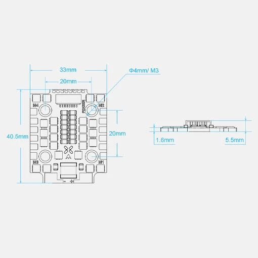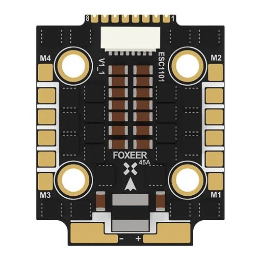 L’ESC 4en1 Foxeer est composé d’un firmware BLHeli_32 pouvant supporter un ampérage continu d’environ 45A et 65A en pic. Alimenté par une batterie LiPo de 3 à 6S (non incluse), cet ESC offre des performances stables et une expérience de vol ultra-fluide. Des trous de montage de 20 x 20 mm sont également présents pour installer l’ESC sur le châssis.