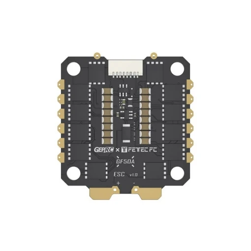 Cet ESC possède aussi des condensateurs intégrés qui assurent une réduction efficace des interférences. L’ESC Fettec GF50A prend en charge les protocoles DShot 300 à 2400 ainsi que MultiShot. Léger (13 g) et compact, il s’installe en toute facilité sur votre châssis grâce à ses trous de montage en 30,5 x 30,5 mm (M4). Pour l’alimenter, utilisez une batterie LiPo 2 à 6S (non fournie).