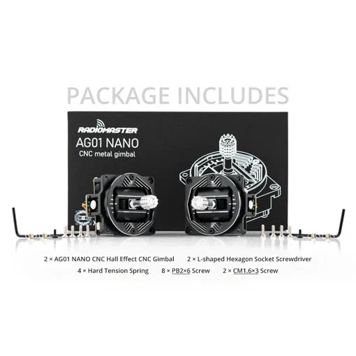 Ces deux gimbals AG01 Nano de RadioMaster sont destinés à la radiocommande Pocket. Fabriqués en aluminium de qualité aéronautique traité CNC, ils sont d’excellente qualité et offrent un design sobre et classe. Équipés de roulements à billes de précision quadruples, ils proposent des performances renversantes.