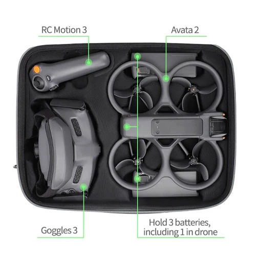 Cette housse vous permettra de stocker un drone DJI Avata 2, des DJI Goggles 3, un DJI RC Motion 3, trois batteries dont une dans le drone, des filtres, câbles et autres petits accessoires essentiels.
