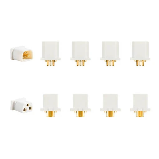Ce kit BetaFPV est composé de dix connecteurs BT3.0, dont cinq connecteurs mâles et cinq connecteurs femelles. Ils sont dotés de deux broches métalliques d’un diamètre de 1,3 mm et d’une broche métallique de 1 mm de diamètre pour équilibrer la charge de vos batteries 2S. Une fois soudés à vos câbles pigtail, ces connecteurs vous permettront de connecter vos batteries à votre drone et d’alimenter ce dernier.