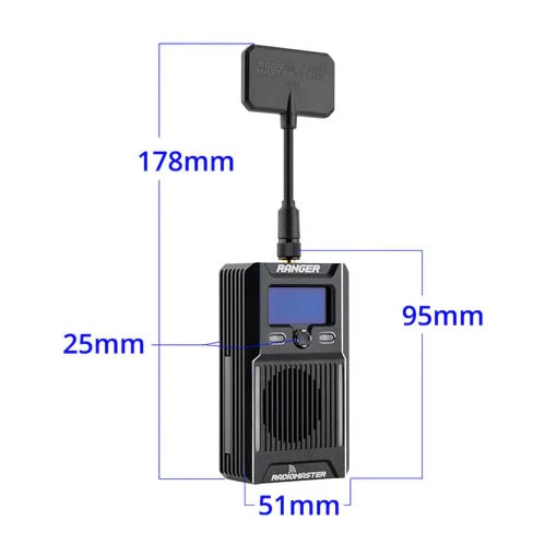 L’émetteur RadioMaster Ranger ELRS 2.4GHz est un émetteur puissant et facile d’utilisation grâce à son écran OLED. Son écran OLED de 64 x 128 p vous permettra en effet d’accéder aux réglages via une touche de navigation à 5 directions. Vous aurez accès à 2 boutons raccourcis que vous pourrez personnaliser selon vos besoins. Cet émetteur RadioMaster est équipé d’une puce RFSX1281IMLTRT, d’un processeur principal ESP32 et d’un processeur auxiliaire ESP8285, garantissant une liaison optimale. Le module Ranger prend en charge le Wi-Fi et le Bluetooth. Il intègre aussi un accéléromètre 3 axes et nécessite une tension de 6 à 16,8 V pour fonctionner.