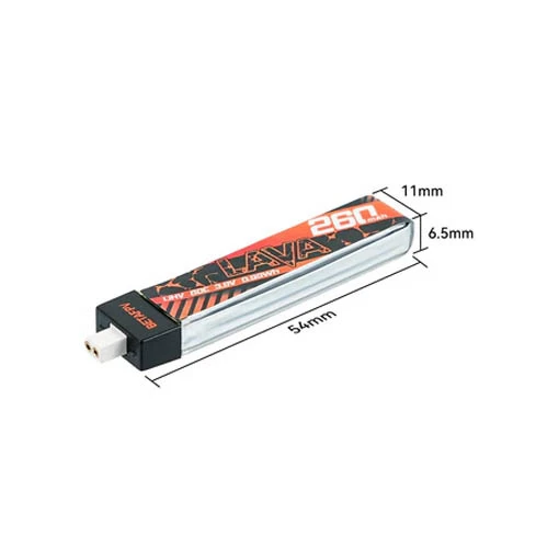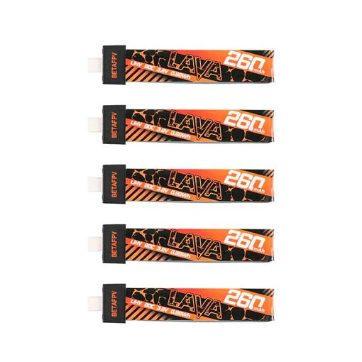 Ce pack BetaFPV se compose de 5 batteries LiHV LAVA dotĂ©es de connecteur BT2.0. Ces batteries possèdent une tension de 1S (3.8 V), un taux de dĂ©charge de 80C et une capacitĂ© de 260mAh. Elles sont compactes et de petite taille, ce qui leur offre un centre de gravitĂ© plus concentrĂ©, et donc une rĂ©ponse plus nette, une meilleure maniabilitĂ© et une grande accĂ©lĂ©ration. Elles bĂ©nĂ©ficient d’un processus de pliage en Z qui offre une amĂ©lioration de la densitĂ© Ă©nergique de 5% par rapport au processus d’enroulement. Chaque batterie pèse environ 7.11 g.