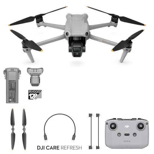 Ce pack se compose d’un DJI Air 3 et sa radiocommande DJI RC-N2, d’une carte mémoire SD Rugged 128Go et d’une assurance DJI Care Refresh 2 ans. Le drone est doté de d’une caméra grand-angle à ouverture f/1.7 au format équivalent 24mm et d’une télécaméra moyenne 3x à ouverture f/2.8 au format équivalent 70mm. Les deux caméras avec capteur CMOS 1/1.3″ sont complémentaires afin de procurer une qualité d’image constante et incomparable, que ce soit pour des paysages ou pour des perspectives uniques. Ensemble, elles délivrent des photos en 48MP et des vidéos jusqu’en 4K 100ips.