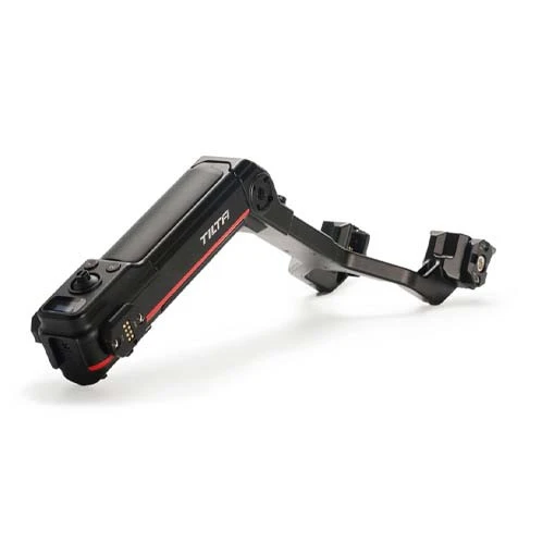 Vous pourrez rajouter différents accessoires grâce aux multiples fixations Arri, Cold Shoe, NATO. La poignée est alimentée par le stabilisateur et se connecte aux ports Nato sur le côté via le bras de déport.