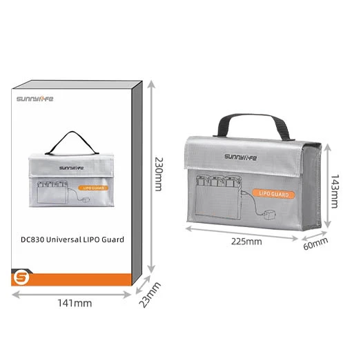 Le sac de sécurité SunnyLife est fait pour stocker et protéger vos batteries LiPo. De dimensions de 225 x 143 x 60 mm avec un poids de 114 g, ce sac est compatible avec la plupart des batteries de drone de petite et moyenne tailles. Il pourra aussi accueillir une station de charge. Ce sac de sécurité SunnyLife a été conçu dans un matériau déperlant et ignifugé, résistant aux fortes chaleurs, explosions, flammes et éclaboussures pour une sécurité renforcée. Il conservera à l’abri vos batteries et les tiendra également à loin des radiations.