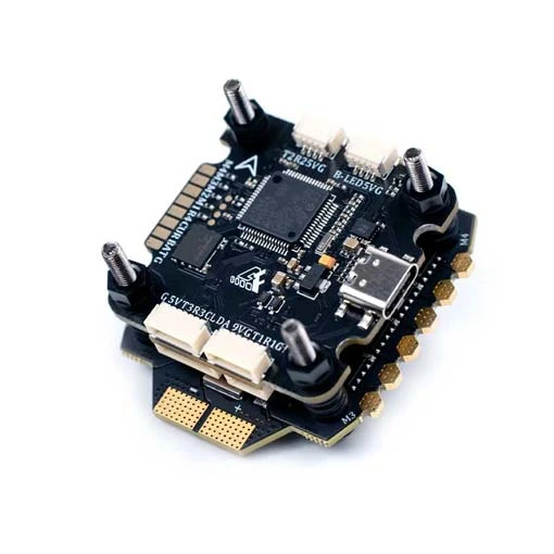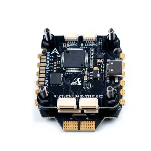 Cette stack propose des trous de montage de 30,5 x 30,5mm pour l’installation sur le châssis. Vous pourrez utiliser une batterie LiPo de 3 à 6S pour l’alimentation. Vous pourrez ajouter un deuxième ESC avec la prise en charge x8 pour monter un Cinefilter ou autres accessoires. Son MOSFET haut de gamme, permet des performances optimales pour les moteurs gourmands. Vous pourrez mettre gaz à fond durant une longue période sans surchauffe.