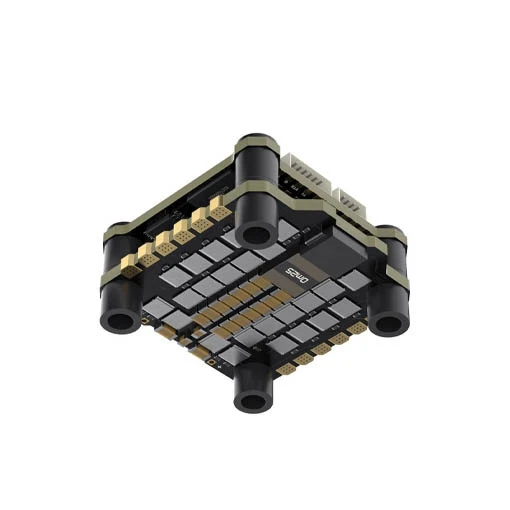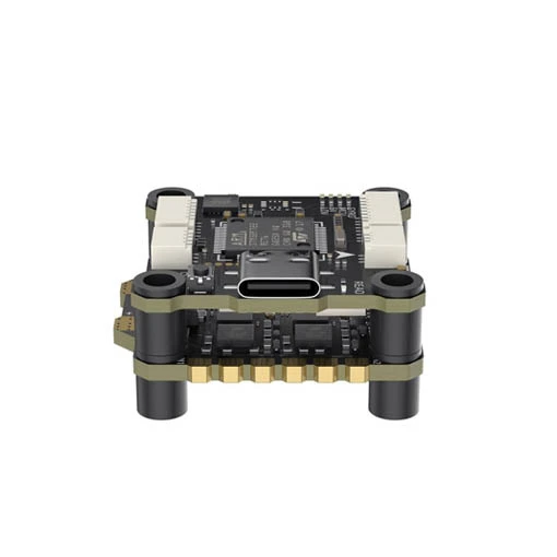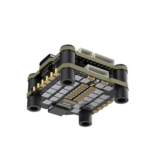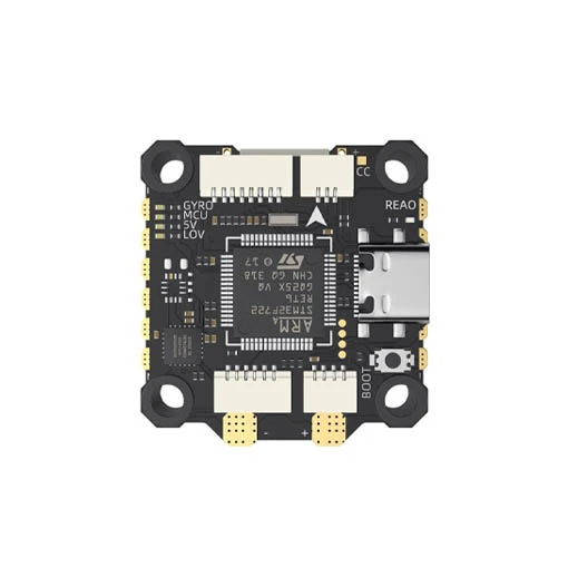 La FC de cette stack est dotée d’un processeur STM32F722RET6, d’un gyroscope MPU6000, d’une Blackbox de 32Mo, de deux BECs (5V 2.5A, 10V 2A) et de 6 UARTs. L’ESC, lui, fonctionne grâce au firmware BLHeli_32 et peut supporter un courant continu de 55A et 60A en pic (pendant environ 5 secondes). Il prend en charge les protocoles Oneshot124, Oneshot42, Multishot et Dshot 150/300/600.