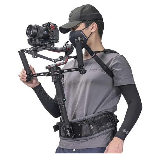 Le système de stabilisateur à double poignée est conçu pour prendre en charge les stabilisateurs DJI comme le DJI RS2, RSC2, RS 3 Serie et RS 4 Series. Cet accessoire offre à l’utilisateur un meilleur confort dans la prise de vue et une meilleure répartition du poids pour des longs tournages. Le gilet intègre un adaptateur réglable en hauteur pour monter vos stabilisateurs sur le bas de la poignée de la batterie. Attachez le support à double poignée sur voter stabilisateur et utiliser les bretelles et les sangles de support pour attacher les poignées au gilet.
