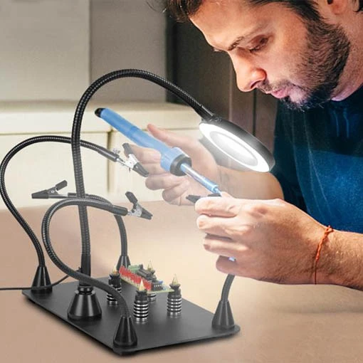 Cette troisième main possède également un bras flexible magnétique avec à son bout une loupe X3 avec lampe LED. La lampe offre 10 niveaux d’intensité lumineuse et 3 températures de couleur pour une vision parfaite de vos moindres gestes. Livré avec 4 pads en caoutchouc qui permettent d’éviter que le plateau ne glisse de votre plan de travail !